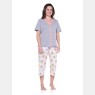 Conjunto manga curta aberta com fechamento por botão, em tecido colorido meia-malha mescla (88% algodão 12% poliéster) e corsário com estampa corrida, confeccionado em tecido meia-malha 100% algodão.
