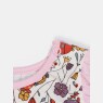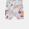 Macacão manga curta com estampa corrida, babado, abertura na gola entre as pernas por tic-tac para facilitar o vestir, confeccionado em tecido meia-malha 100% algodão.