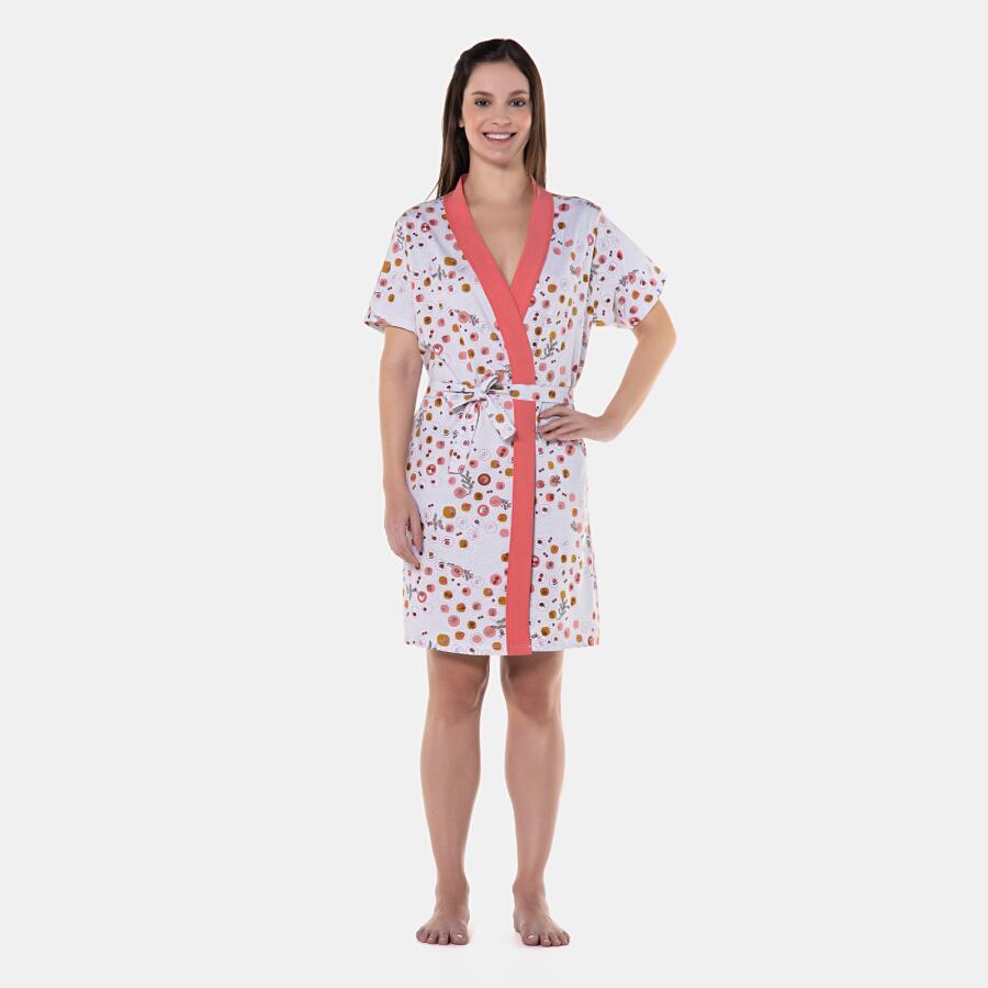 Robe manga curta com fechamento por transpasse, cinto, estampa corrida e laço, confeccionado em tecido meia-malha 100% algodão.