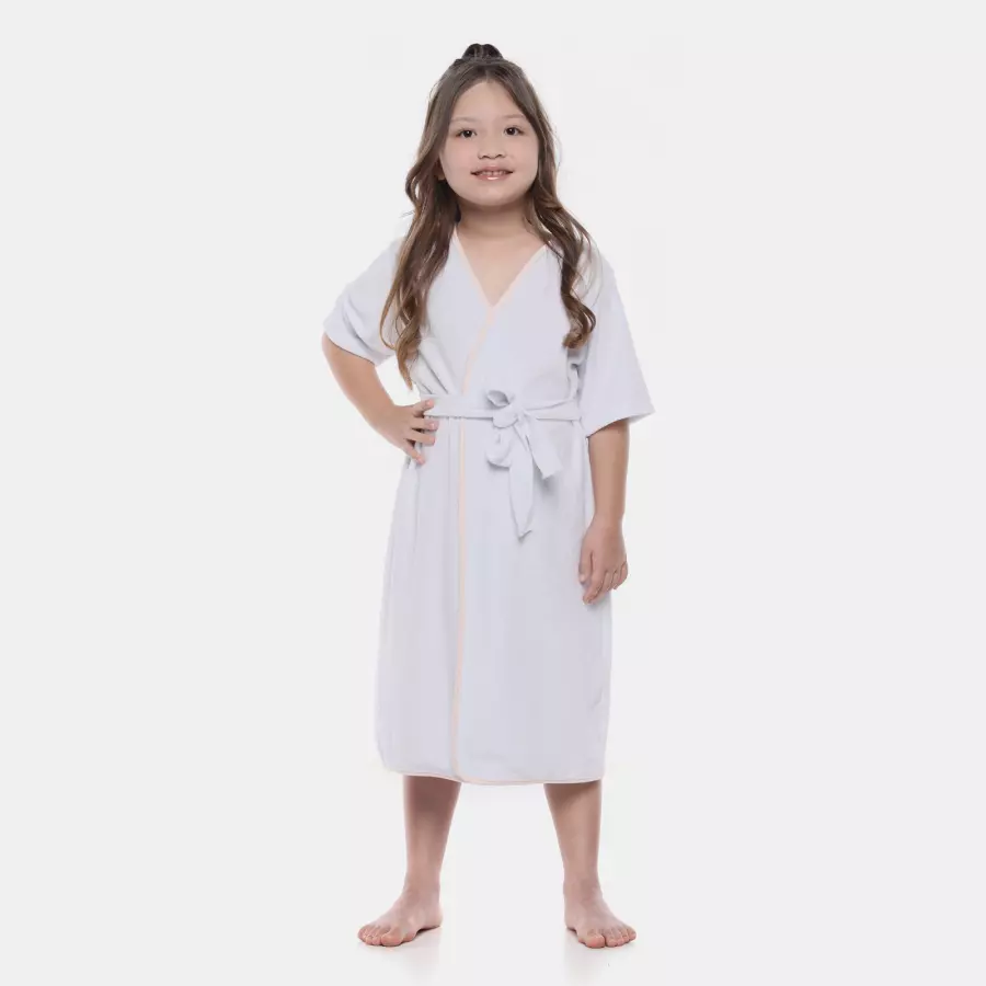 Roupão manga curta com fechamento por transpasse e cinto, estampa local nas costas, confeccionado em tecido atoalhado (85% algodão / 15% poliéster).