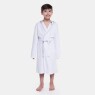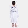 Roupão manga longa, com fechamento por transpasse e cinto, em tecido liso, capuz em estampa corrida, confeccionado em tecido atoalhado (85% algodão / 15% poliéster).