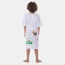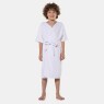 Roupão manga curta com fechamento por transpasse, cinto, estampa local nas costas, confeccionado em tecido liso atoalhado (85% algodão e 15% poliéster).