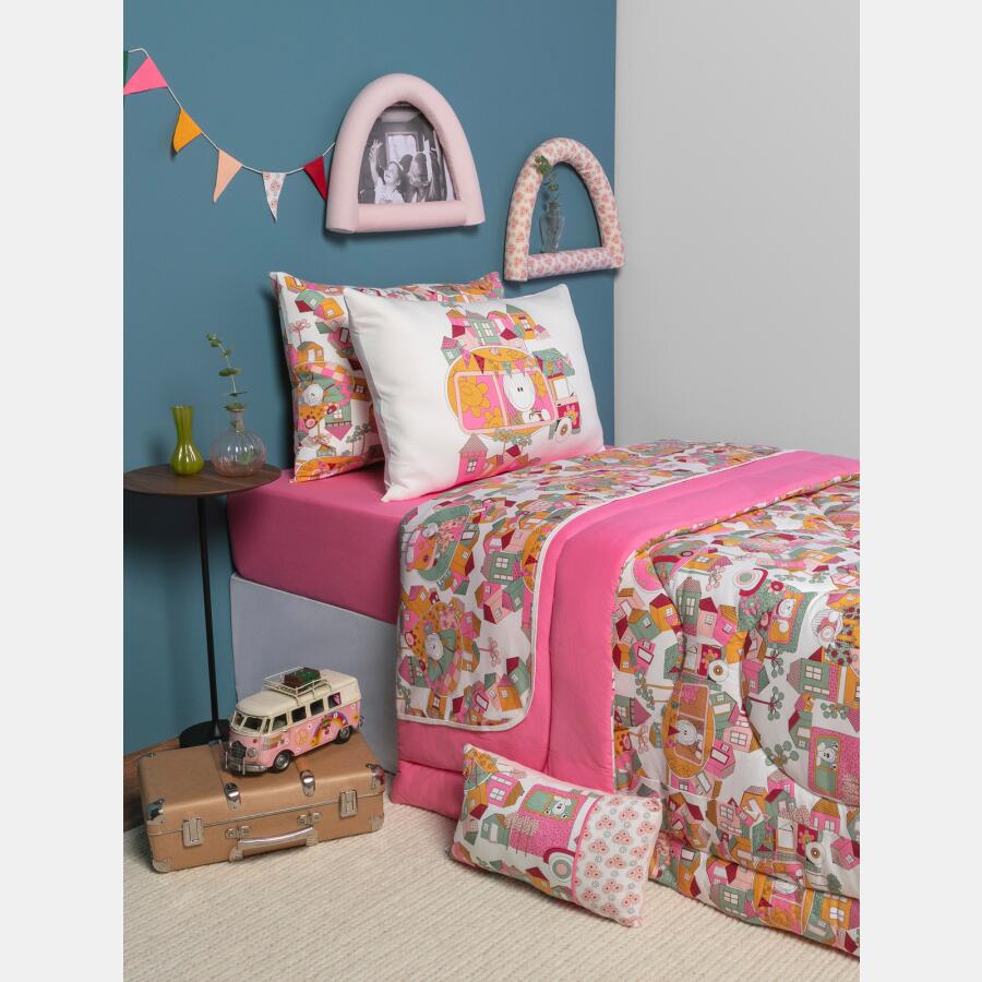 Jogo de lençol tamanho berço, composto por 1 lençol com elástico em tecido colorido liso, 1 sobre lençol com acabamento em viés e estampa corrida com personagem, e 1 fronha com estampa local, confeccionados em tecido meia-malha 100% algodão. As fronhas que compõem o jogo de lençol são expostas na foto sempre à frente das fronhas avulsas, também vendidas no site. Não acompanha, outras fronhas avulsas, almofadas e outros acessórios expostos na imagem. Imagem meramente ilustrativa.