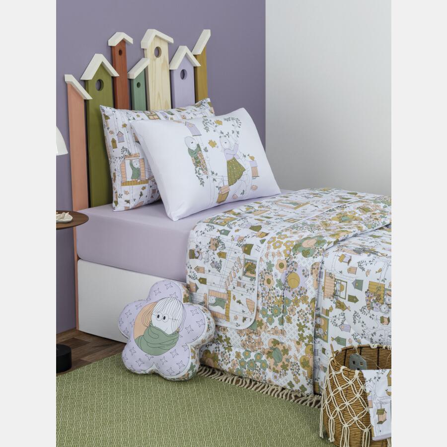 Jogo de lençol tamanho queen composto por 1 lençol com elástico em tecido colorido liso, 1 sobre lençol com acabamento em viés e estampa corrida com personagem, e 2 fronhas com estampa local, confeccionados em tecido meia-malha 100% algodão. As fronhas que compõem o jogo de lençol são expostas na foto sempre à frente das fronhas avulsas, também vendidas no site. Não acompanha, outras fronhas avulsas, almofadas e outros acessórios expostos na imagem. Imagem meramente ilustrativa.