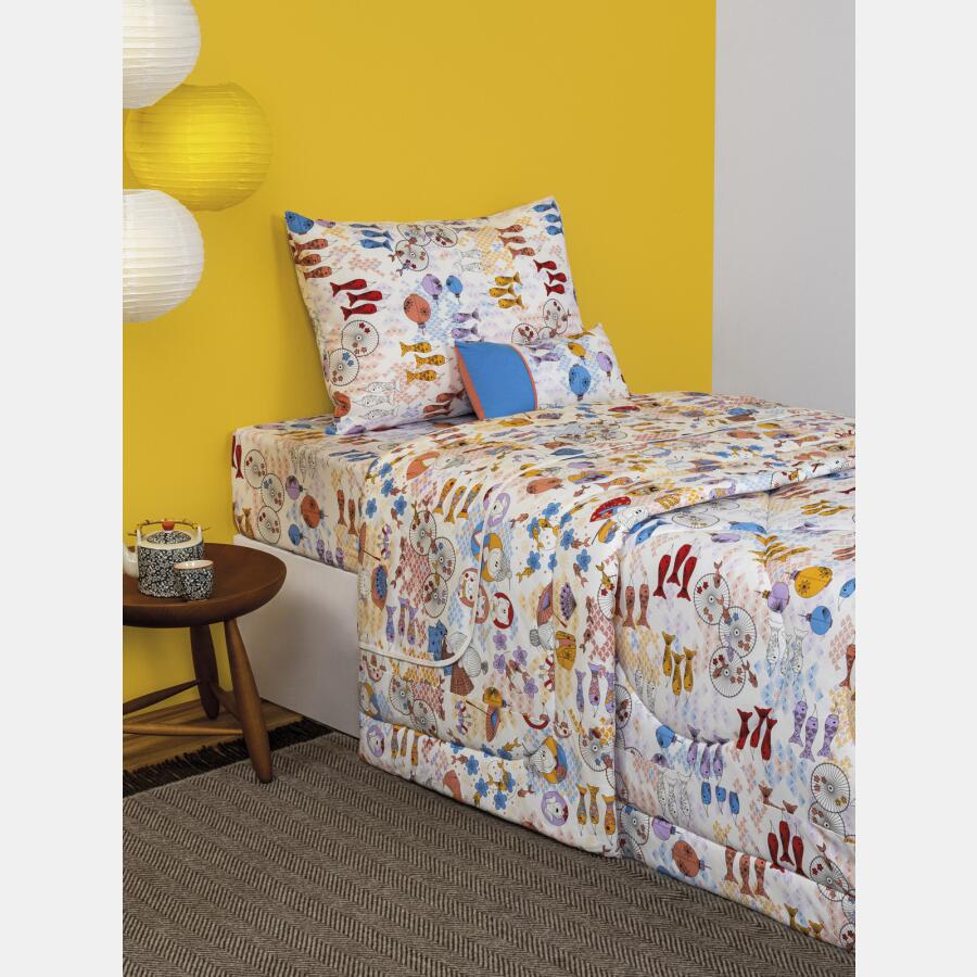 Jogo de lençol tamanho solteiro, composto por 1 lençol com elástico com estampa corrida, 1 sobre lençol com acabamento em viés com estampa corrida com personagem e 1 fronha com estampa corrida, confeccionados em tecido meia-malha 100% algodão. Não acompanha, outras fronhas avulsas, almofadas e outros acessórios expostos na imagem. Imagem meramente ilustrativa.