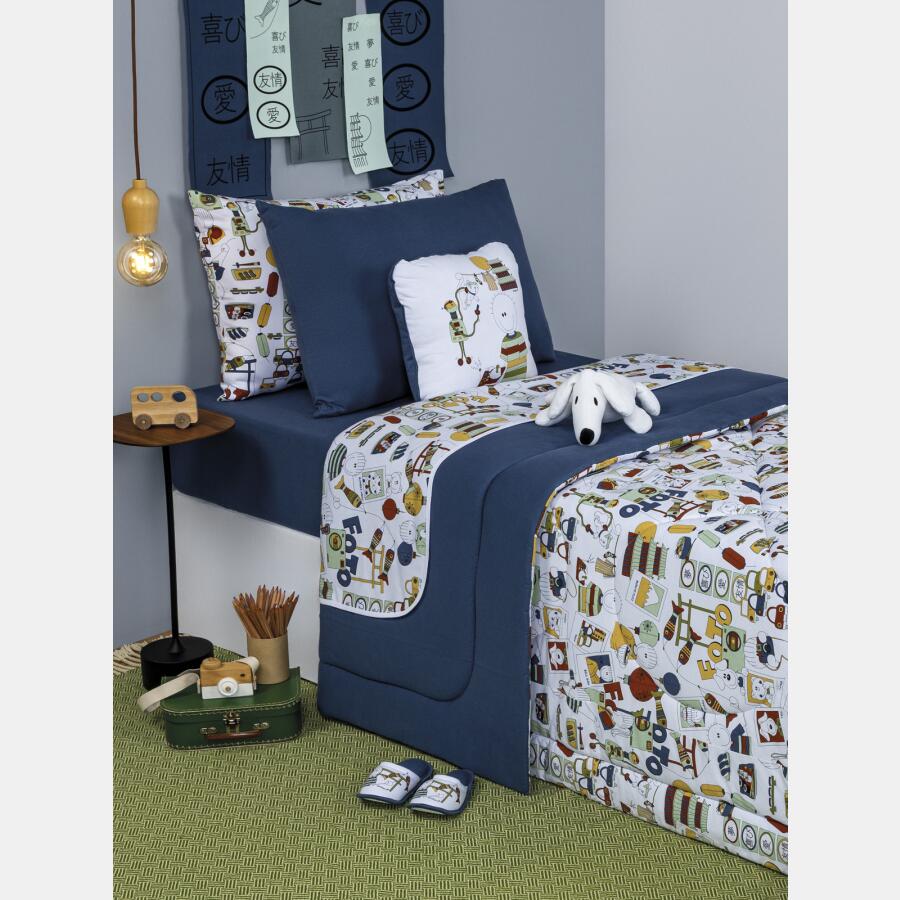 Jogo de lençol tamanho berço, composto por 1 lençol com elástico com tecido colorido liso e 1 fronha em tecido colorido liso, 1 sobre lençol com acabamento em viés e estampa corrida com personagem, confeccionados em tecido meia-malha 100% algodão. As fronhas que compõem o jogo de lençol são expostas na foto sempre à frente das fronhas avulsas, também vendidas no site. Não acompanha, outras fronhas avulsas, almofadas e outros acessórios expostos na imagem. Imagem meramente ilustrativa.