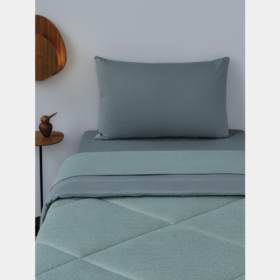 Jogo de lençol tamanho queen, composto por 1 lençol com elástico com tecido colorido liso e 2 fronhas com tecido colorido liso, 1 sobre lençol com acabamento em viés e estampa corrida em listras, confeccionados em tecido meia-malha 100% algodão. Não acompanha, outras fronhas avulsas, almofadas e outros acessórios expostos na imagem. Imagem meramente ilustrativa.
