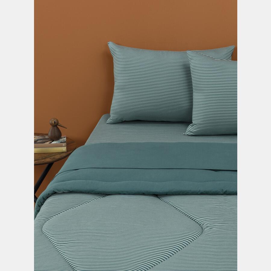 Jogo de lençol tamanho queen, composto por 1 lençol com elástico em tecido colorido liso, 1 sobre lençol com acabamento em viés e 2 fronhas com estampa corrida em listras, confeccionados em tecido meia-malha 100% algodão. As fronhas que compõem o jogo de lençol são expostas na foto sempre à frente das fronhas avulsas, também vendidas no site. Não acompanha, outras fronhas avulsas, almofadas e outros acessórios expostos na imagem. Imagem meramente ilustrativa.