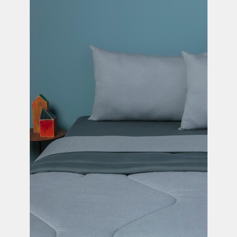 Jogo de lençol tamanho solteiro, composto por 1 lençol com elástico com tecido colorido liso e 1 fronha em tecido listrado, 1 sobre lençol com acabamento em viés e estampa corrida em listras, confeccionados em tecido meia-malha 100% algodão. Não acompanha, outras fronhas avulsas, almofadas e outros acessórios expostos na imagem. Imagem meramente ilustrativa.