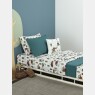 Lençol tamanho berço com elástico em tecido estampado com personagem e 2 fronhas, 1 com estampa corrida e 1 em tecido colorido liso, confeccionados em meia-malha 100% algodão. Não acompanha, outras fronhas avulsas, almofadas e outros acessórios expostos na imagem. Imagem meramente ilustrativa.