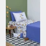 Lençol tamanho casal com elástico com estampa corrida com personagem e 4 fronhas, 2 com estampa corrida e 2 em tecido colorido liso, confeccionados em meia-malha 100% algodão. Não acompanha, outras fronhas avulsas, almofadas e outros acessórios expostos na imagem. Imagem meramente ilustrativa.