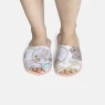 Pantufa com abertura e estampa corrida, confeccionada em tecido meia-malha 100% algodão, enchimento 100% poliéster e sola em EVA.