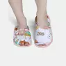 Pantufa com abertura e estampa corrida, confeccionada em tecido meia-malha 100% algodão, enchimento 100% poliéster e sola em EVA.
