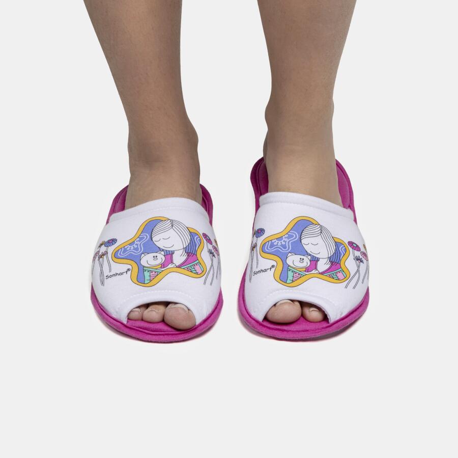 Pantufa aberta com estampa local, confeccionada em tecido meia-malha 100% algodão, enchimento 100% poliéster e sola em EVA.