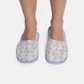 Pantufa fechada com estampa corrida, confeccionada em tecido meia-malha 100% algodão, enchimento 100% poliéster e sola em EVA.