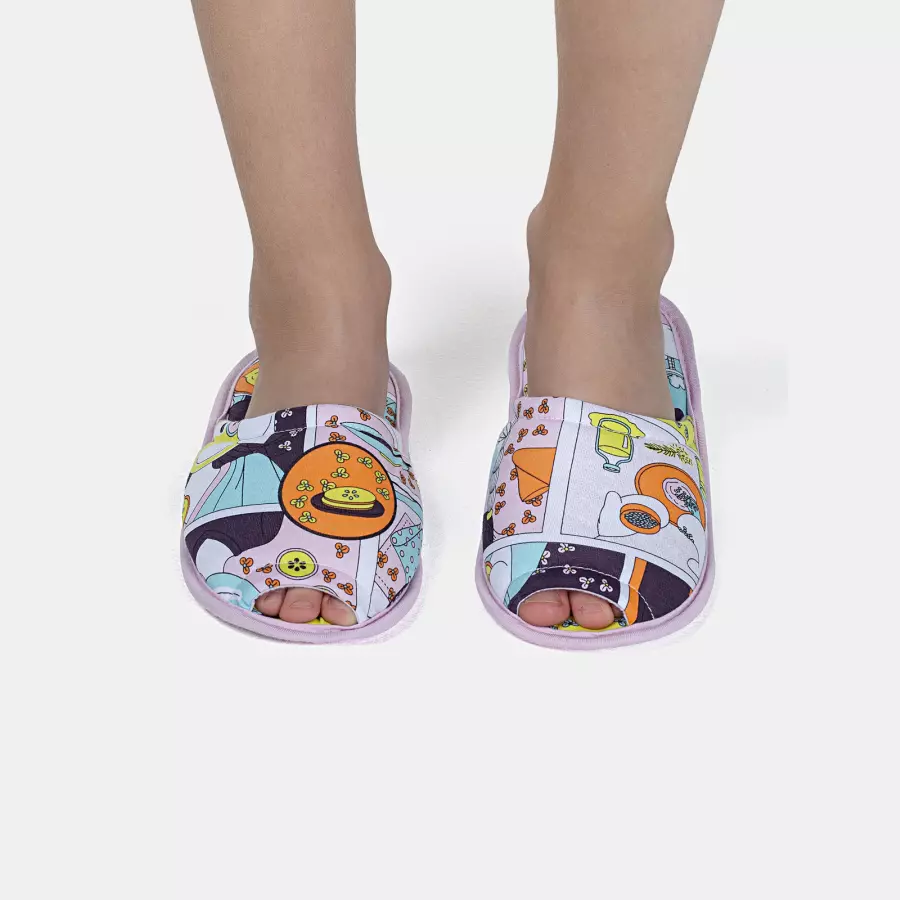 Pantufa com abertura e estampa corrida, confeccionada em tecido meia-malha 100% algodão, enchimento 100% poliéster e sola em EVA.