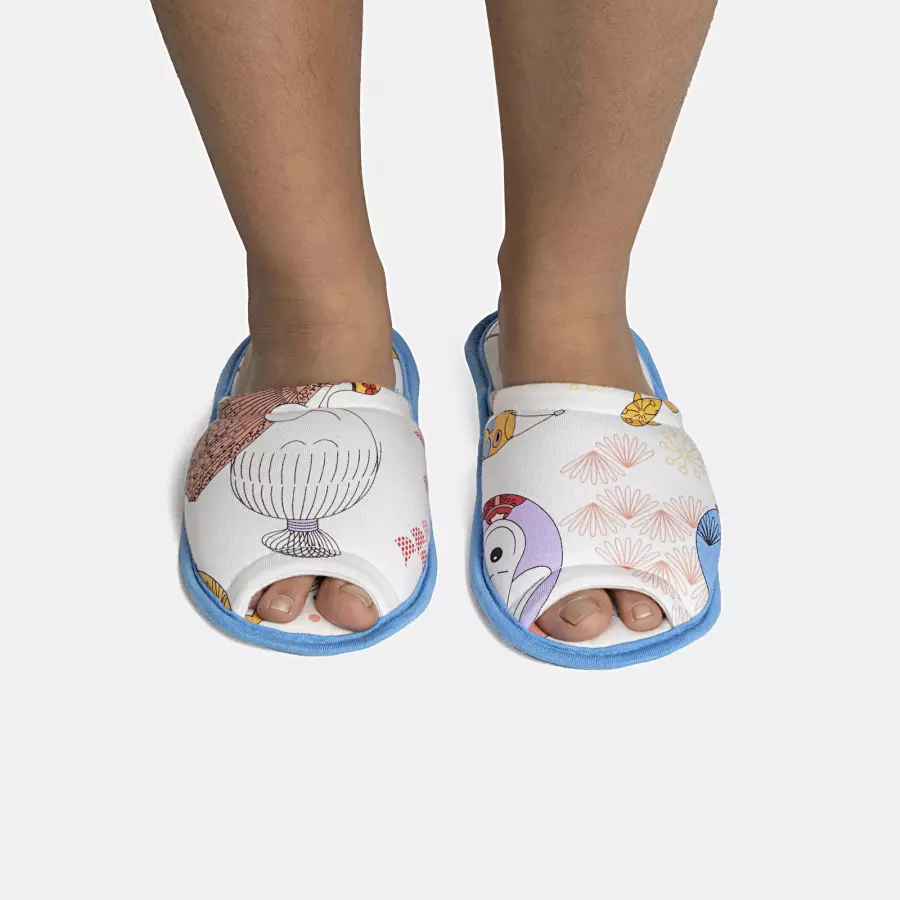 Pantufa com abertura e estampa corrida, confeccionada em tecido meia-malha 100% algodão, enchimento 100% poliéster e sola em EVA.