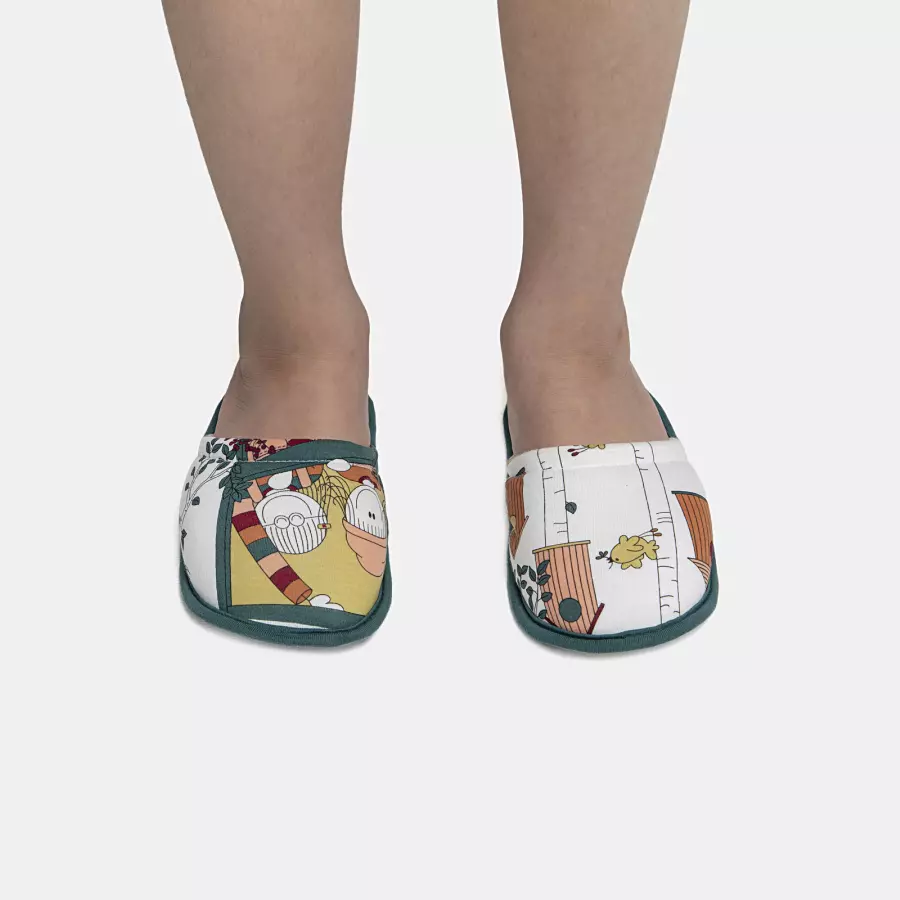 Pantufa fechada com estampa corrida, confeccionada em tecido meia-malha 100% algodão, enchimento 100% poliéster e sola em EVA.