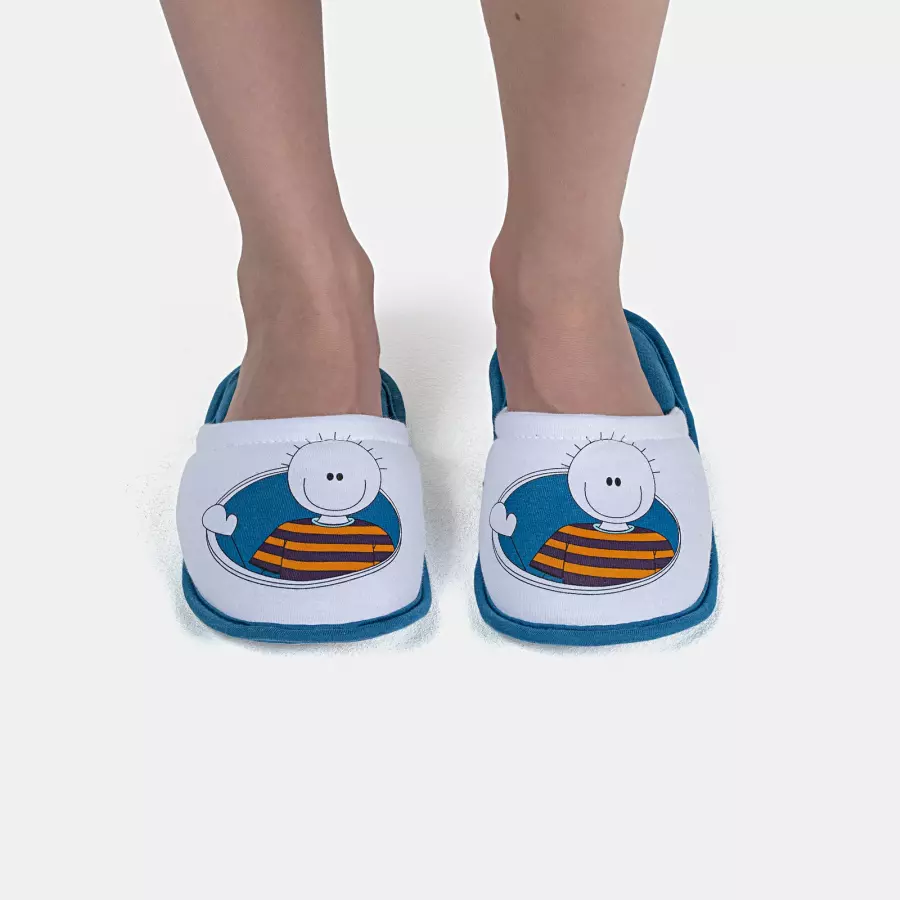Pantufa fechada com estampa local, confeccionada em tecido meia-malha 100% algodão, enchimento 100% poliéster e sola em EVA.