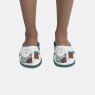 Pantufa fechada com estampa local, confeccionada em tecido meia-malha 100% algodão, enchimento 100% poliéster e sola em EVA.