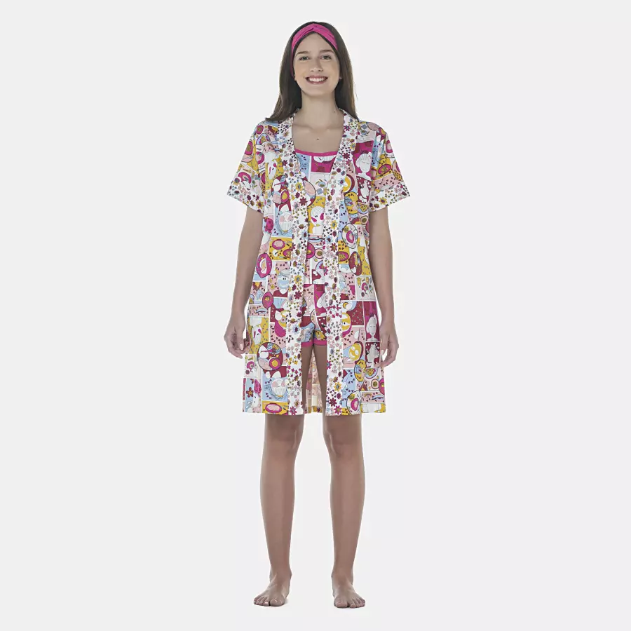 Robe manga curta com fechamento por transpasse e cinto, com estampa corrida, confeccionado em tecido meia-malha 100% algodão.