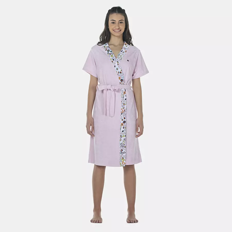 Roupão manga curta com fechamento por cinto com detalhe em viés em tecido meia-malha 100% algodão com estampa corrida, confeccionado em tecido colorido atoalhado (85% algodão e 15% poliéster).