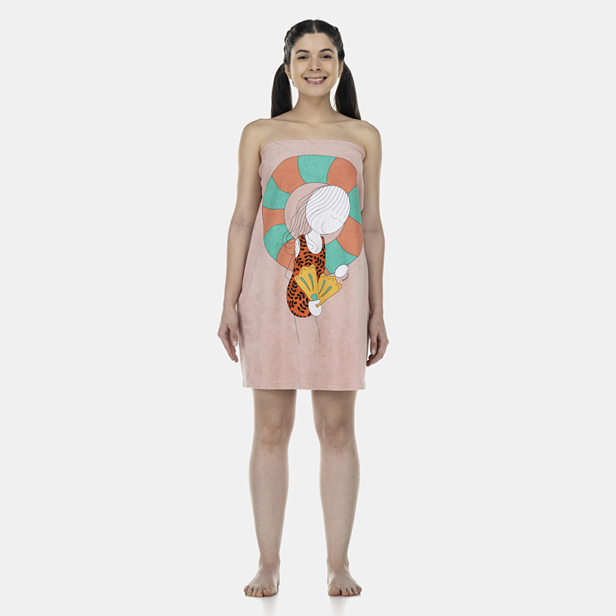 Roupão tomara que caia com estampa local na parte frontal com elástico na parte superior e abertura frontal com fechamento por velcro, confeccionado em tecido atoalhado (85% algodão e 15% poliéster).