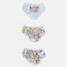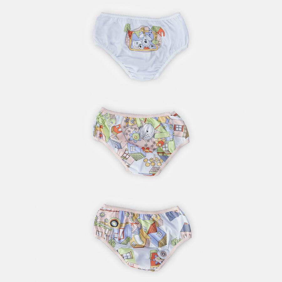 Kit composto por 3 unidades de calcinhas, sendo duas com estampa corrida e uma com estampa local, elástico nas bordas, confeccionadas em tecido meia-malha 100% algodão.