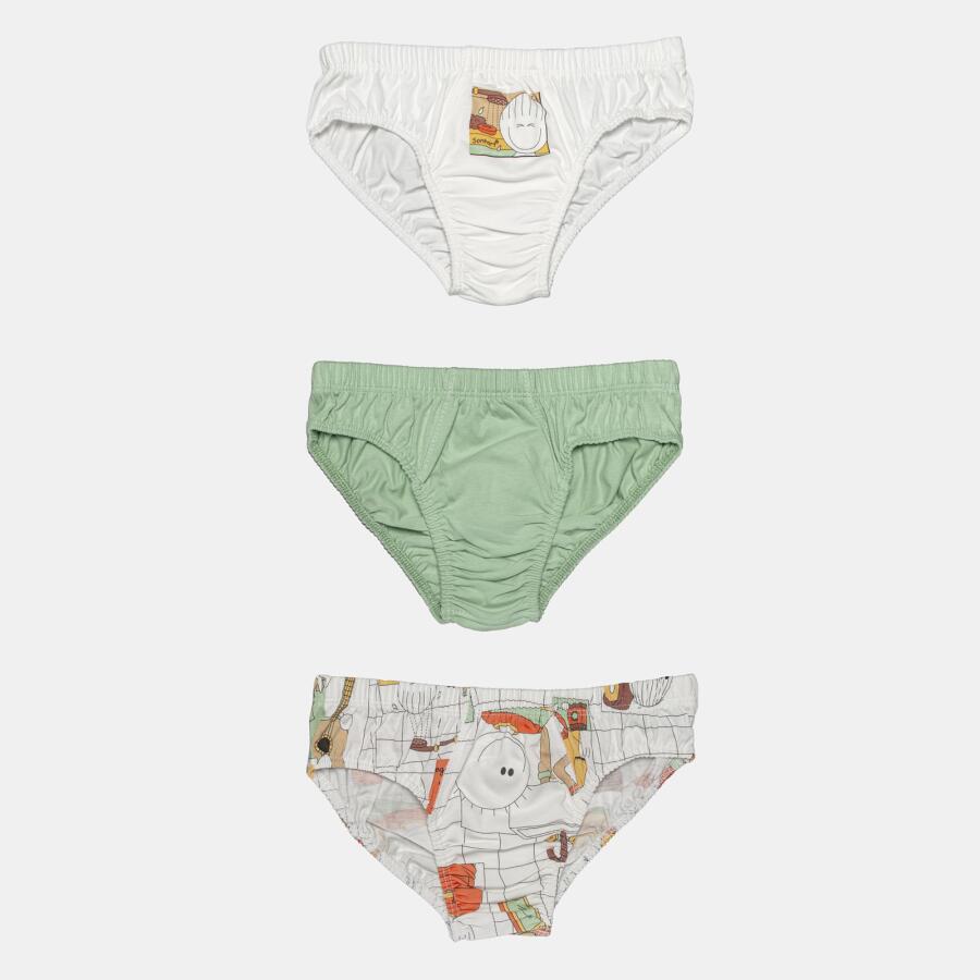 Kit composto por 3 unidades de cuecas, sendo uma com estampa corrida, uma com estampa local e uma em tecido colorido liso, elástico nas bordas, confeccionadas em tecido meia-malha 100% algodão.