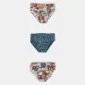Kit composto por 3 unidades de cuecas, sendo duas com estampa corrida e uma em tecido colorido liso, elástico nas bordas, confeccionadas em tecido meia-malha 100% algodão.
